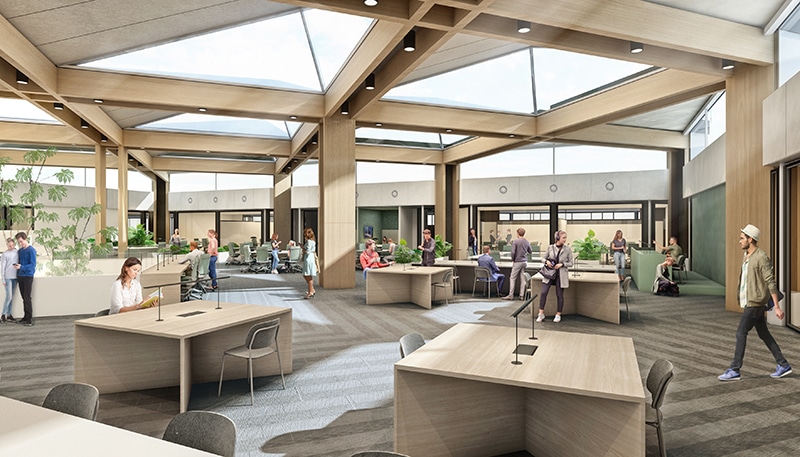 Total Engineer TWIN (Team V Architectuur, Royal HaskoningDHV, DGMR) heeft het ontwerp voor de renovatie deze zomer afgerond. Het gebouw zal onder andere een deels verhoogd dak met een bijzondere houten constructie krijgen. Hierdoor ontstaat een hoge en lichte atriumruimte op de eerste verdieping. Deze lichte ruimte is middels een opening verbonden met de begane grond. Het aanvullende interieurontwerp door Müller van Tol in samenwerking met Team V is in een afrondende fase. Hierin wordt een gevarieerd kleurenpallet toegevoegd aan de grijstinten van het bestaande gebouw en een materiaaltoepassing die aansluit op de renovatie.