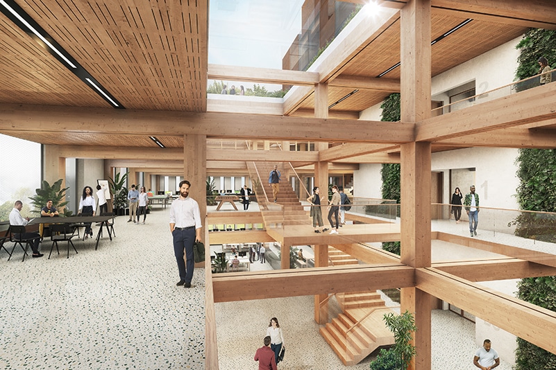 Wat opvalt aan het nieuwe kantoorgebouw is de toepassing van houten vloeren en kolommen. Onder andere bij Triodos Bank deden we ervaring op met houten vloeren in combinatie met contactgeluid. Deze kennis kunnen we voor Westpoort gebruiken. Uiteraard heeft bij de detaillering van de lichte vloeren en de constructie de brandveiligheid onze aandacht. En om de visuele beleving van de houten plafonds zo optimaal mogelijk te maken, bedachten we uitsparingen in de houten vloersystemen, zodat de hoofdtracés van de installaties zoveel mogelijk geïntegreerd worden.