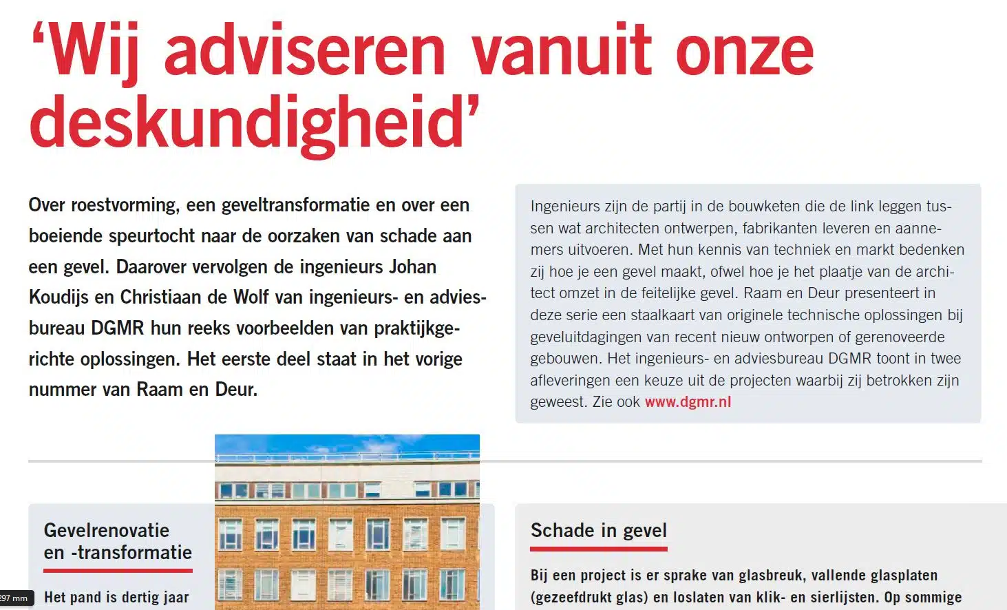 Over roestvorming, een geveltransformatie en over een boeiende speurtocht naar de oorzaken van schade aan een gevel. Daarover vervolgen de ingenieurs Johan Koudijs en Christiaan de Wolf van ingenieurs- en adviesbureau DGMR hun reeks voorbeelden van praktijkgerichte oplossingen. Het eerste deel staat in het vorige nummer van Raam en Deur.