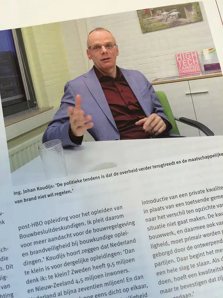 Johan Koudijs: ‘Helaas zijn in veel gevallen de kosten nog steeds leidend. Het advies kan zijn dat een hoger brandveiligheidsniveau nodig is, maar de gebouweigenaar vraagt dan gelijk: moet dat? Nee, dat moet niet volgens het Bouwbesluit. Dan wordt het direct weer geschrapt. Brandveiligheid moet onderdeel worden van een maatschappelijk debat, want de overheid zal steeds verder terugtreden.'