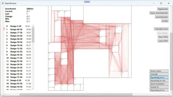 Dat is de vraag die Boaz van der Vijver in zijn afstudeeronderzoek stelt. De aanleiding voor dit onderzoek is de toenemende behoefte aan efficiënte, onderbouwde akoestische adviezen bij complexe bouwprojecten, zoals theaters en zwembaden. Door literatuur, interviews en ontwerpend onderzoek is een digitale tool ontwikkeld die automatisch gebouwindelingen genereert en beoordeelt op akoestische prestaties. Met behulp van algoritmes zoals raycasting worden varianten geanalyseerd op geluidsoverdracht tussen ruimtes en via gevels. De onderliggende datastructuur koppelt akoestische en geometrische eigenschappen aan ruimtetypes.